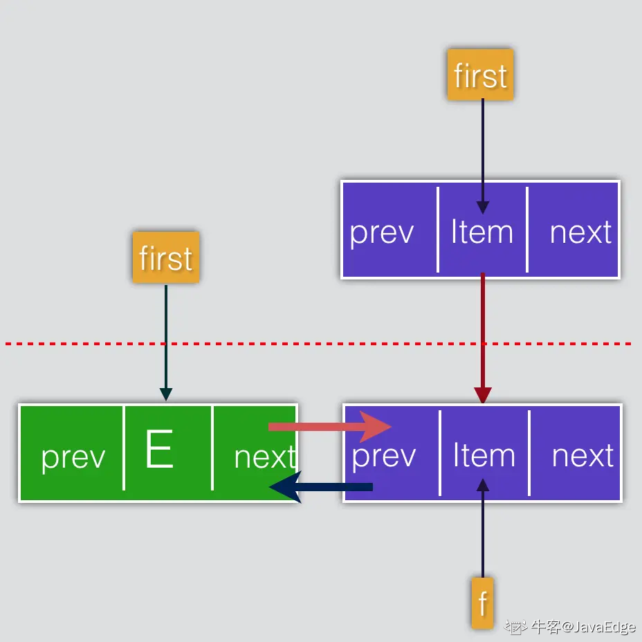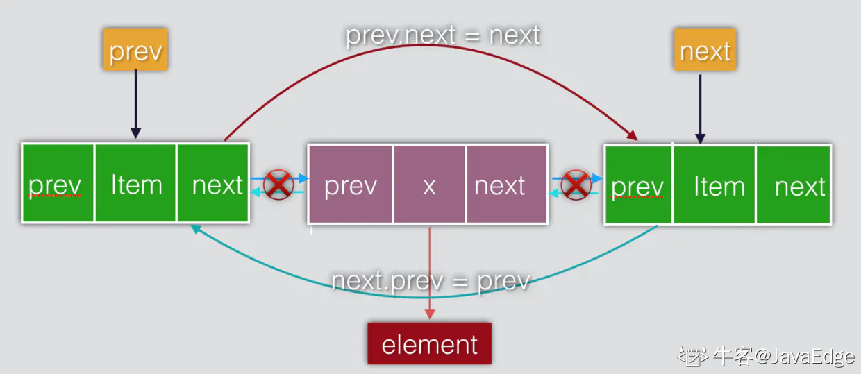 - 若prev为null,则 next 节点直接为 first 节点,反之把prev的next指向next节点,如图上面弯曲的红色箭头
