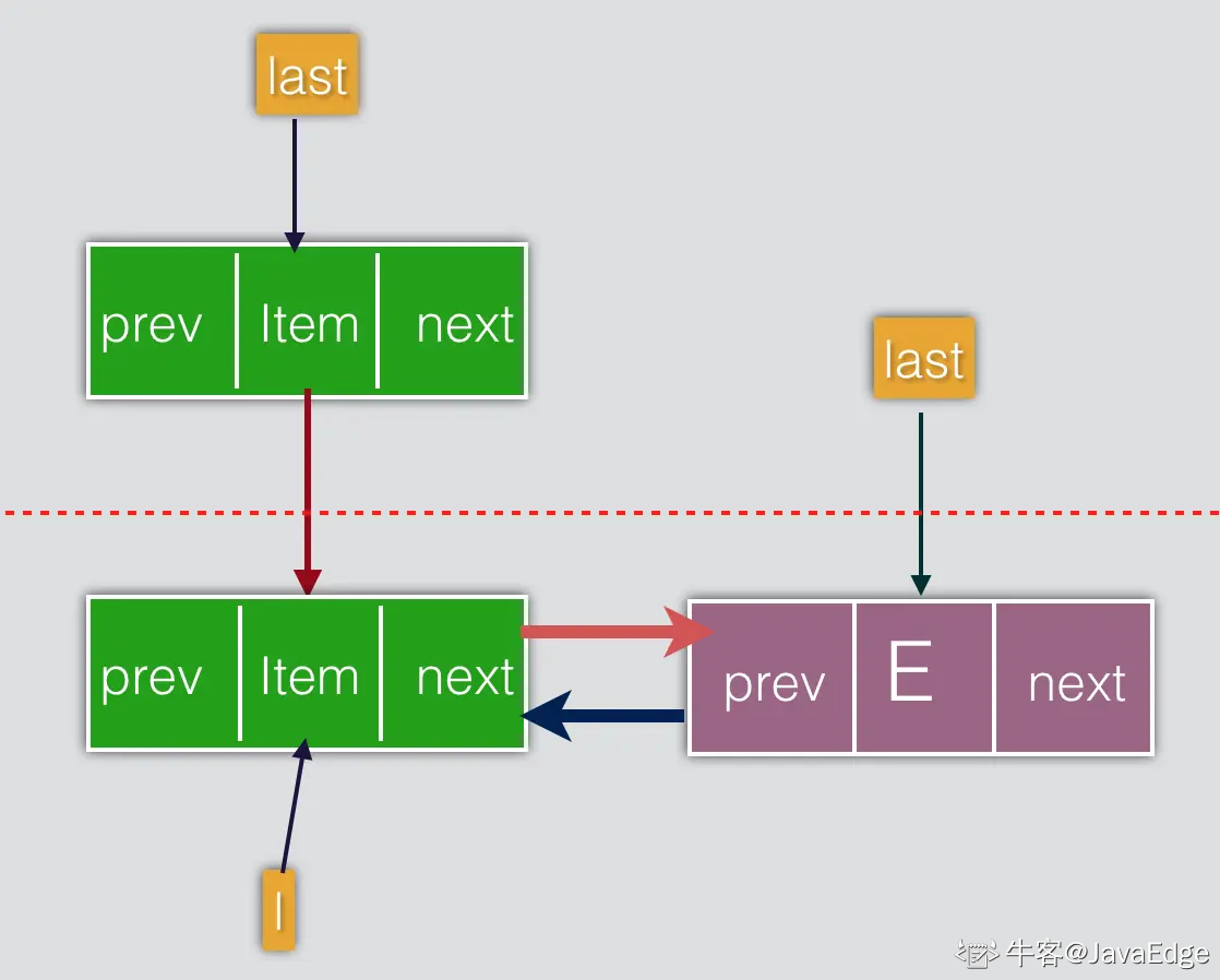 - 若 next 为空,那么prev节点直接为last节点,反之把next的prev指向prev节点,如图下面弯曲的蓝色箭头