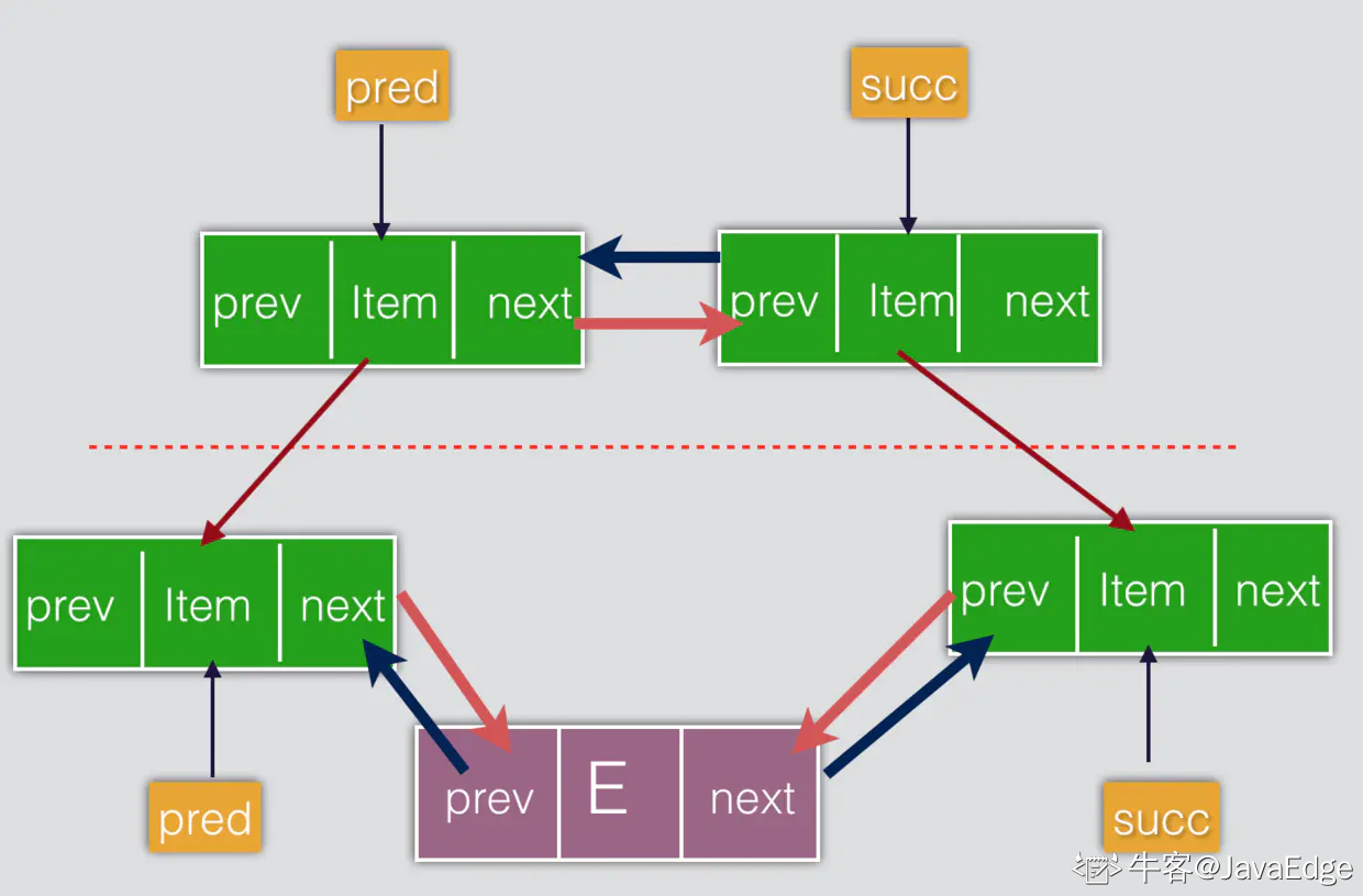 - 若原来的头节点 f 为null,那么新插入头节点也是 last 尾节点,否则设置 f 的前置节点为NewNode,即 NewNode 现在是first 头节点.