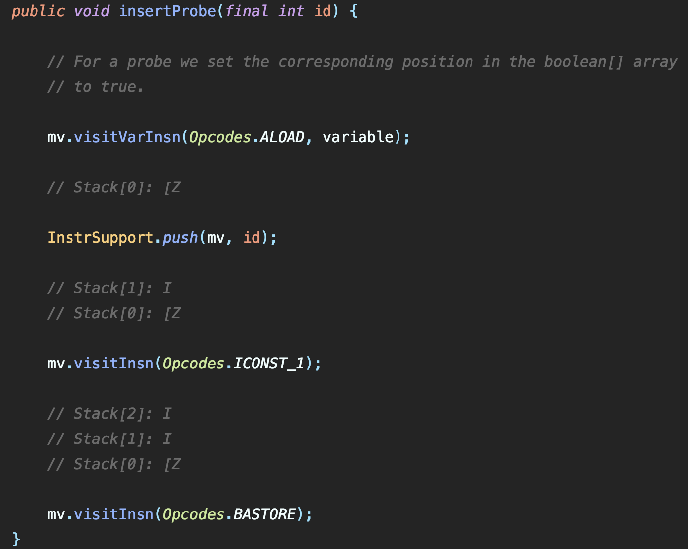 大致就是,在对应字节码的执行入口和跳转入口处,置放 probe,是一个数值(该数值和probe id有关),入栈后加1,则记录一次执行
