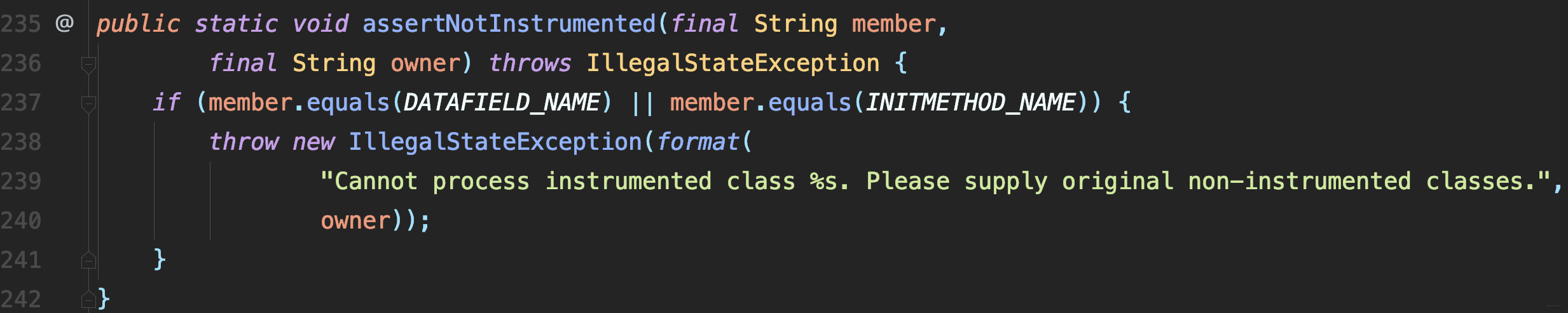 if (member.equals(DATAFIELD_NAME) || member.equals(INITMETHOD_NAME)) { throw new IllegalStateException(format( "Class %s is already instrumented.", owner));