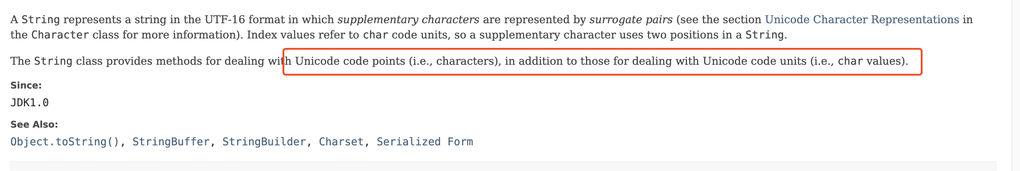 //取到unicode值 int codepoint = testCode.codePointAt(i); //将unicode值转换成char数组 char[] chars = Character.toChars(codepoint); charIndexs.add(pointIndex); if (chars.length > 1) { //表示不是单char字符,记录index时同时添加i+1 charIndexs.add(pointIndex + 1); }