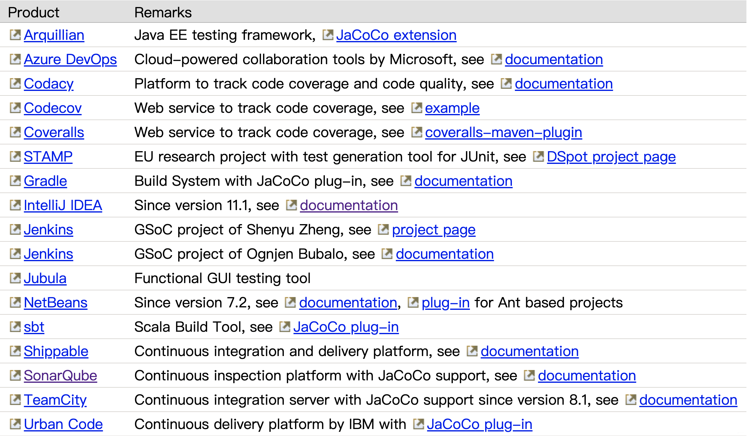目前,JaCoCo已与以下产品和技术集成在一起。