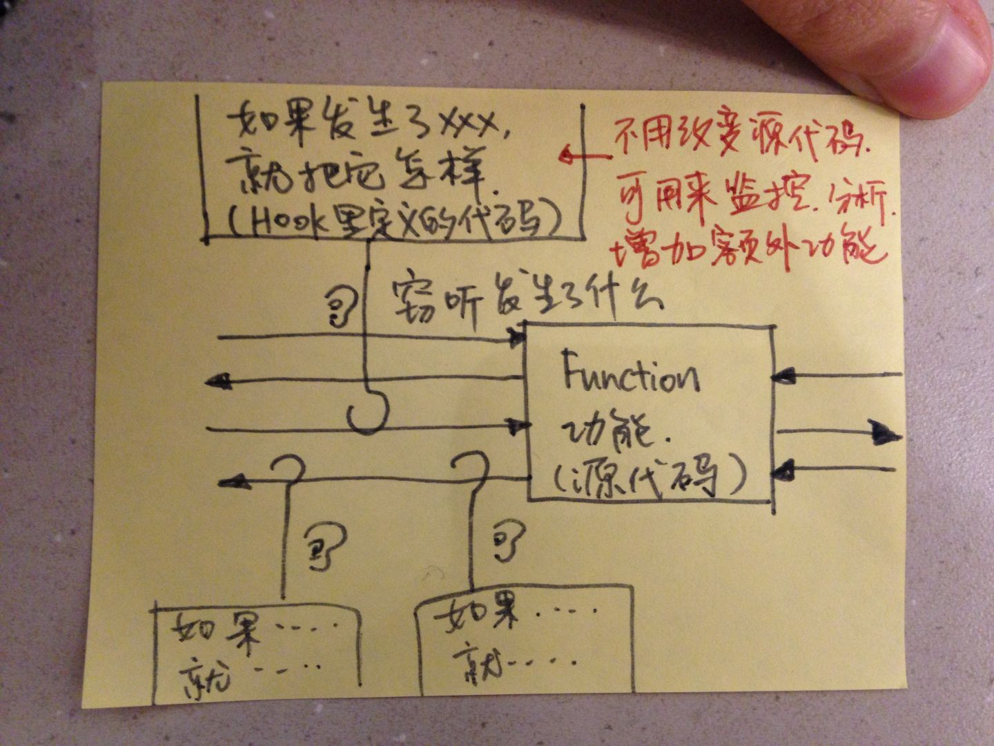 就像一些外来的钩子,在源代码之间钩取一些信息,当捕捉到感兴趣的事时,就拦截下来,让自己的代码执行一下,处理一下这个信息,然后再放出去继续之前的进程。