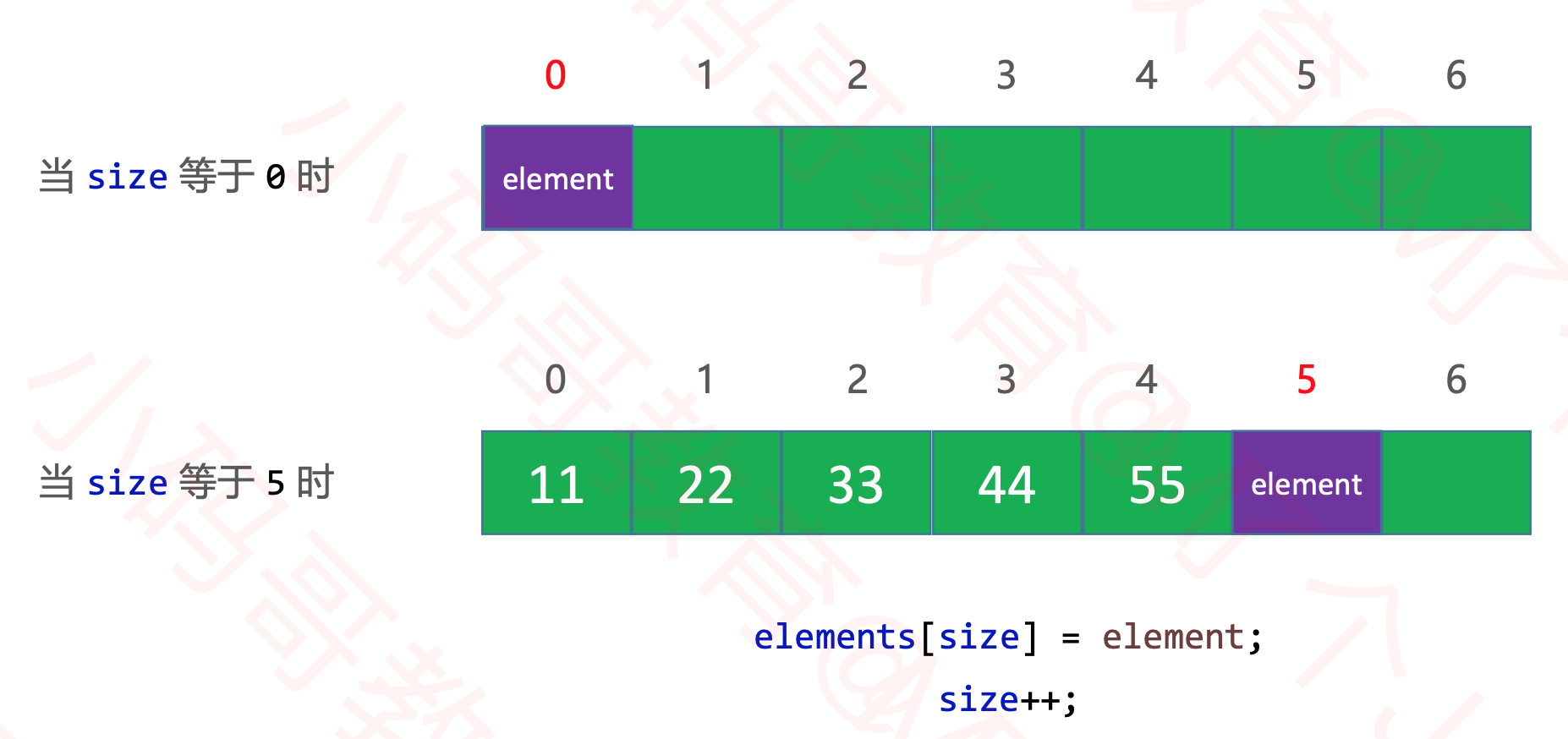 - 需要注意的是, 插入元素的索引也不能越界, 不过不同于删除和设置元素时, 插入的位置可以是所有元素的最后, 即size的位置