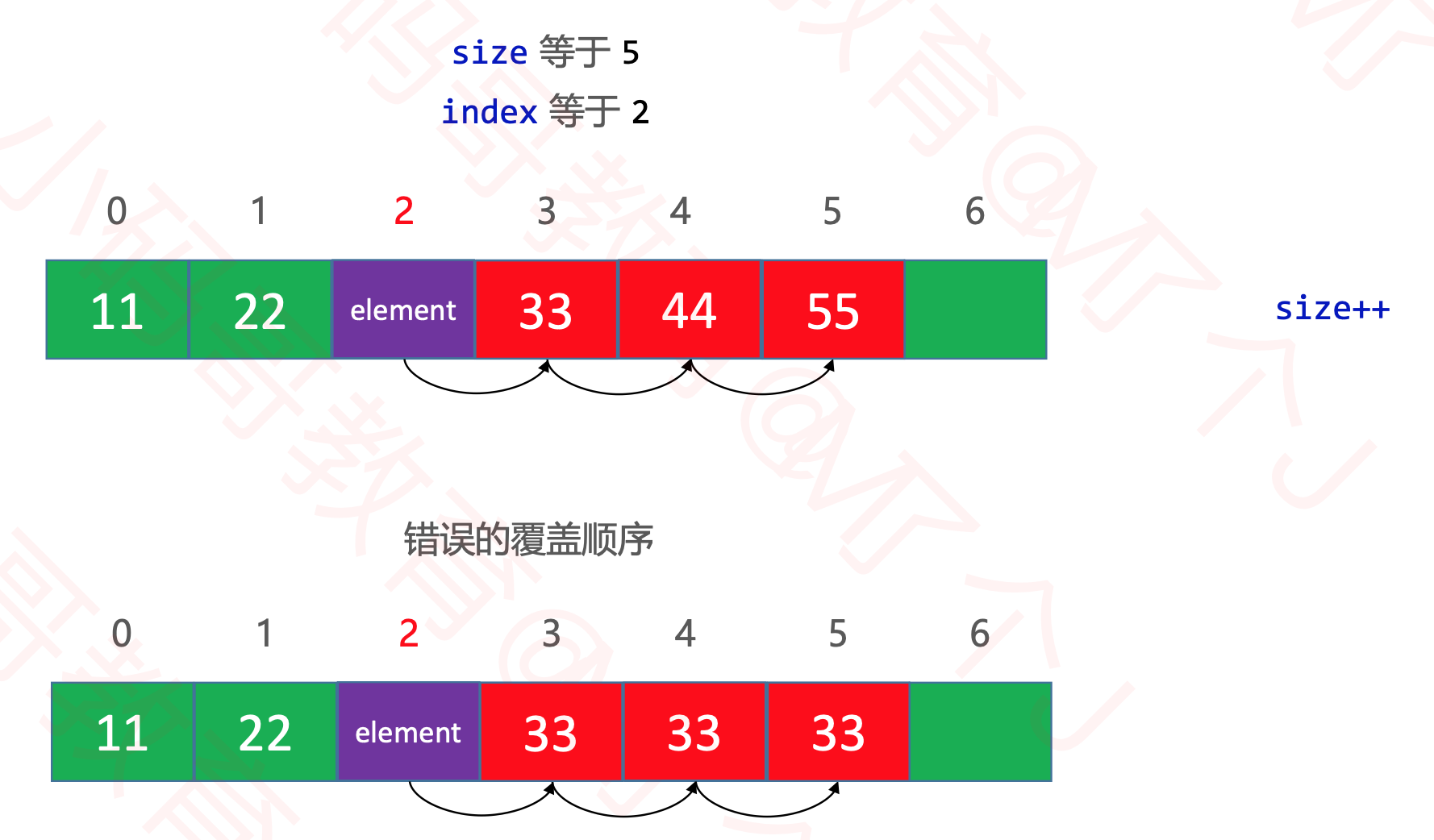 - 注意: 需要从后向前移动元素, 如果从前向后移动元素, 那么会进行元素覆盖, 最后出错