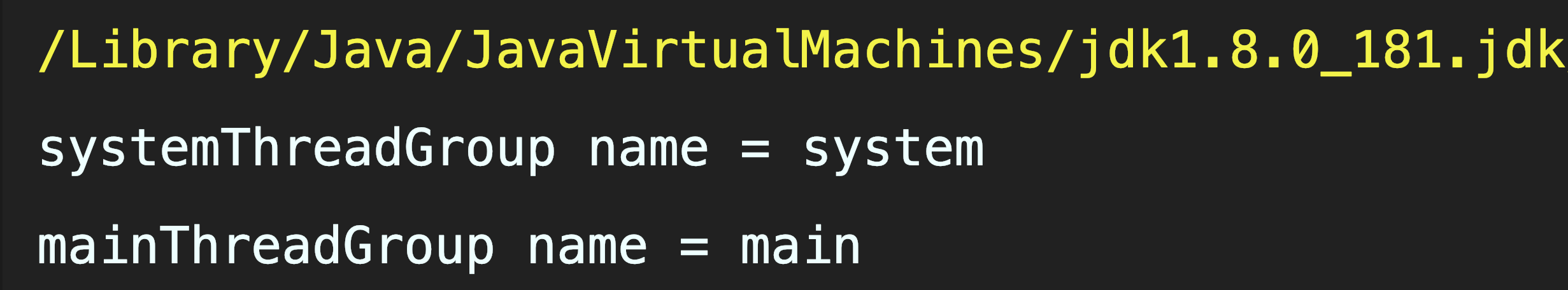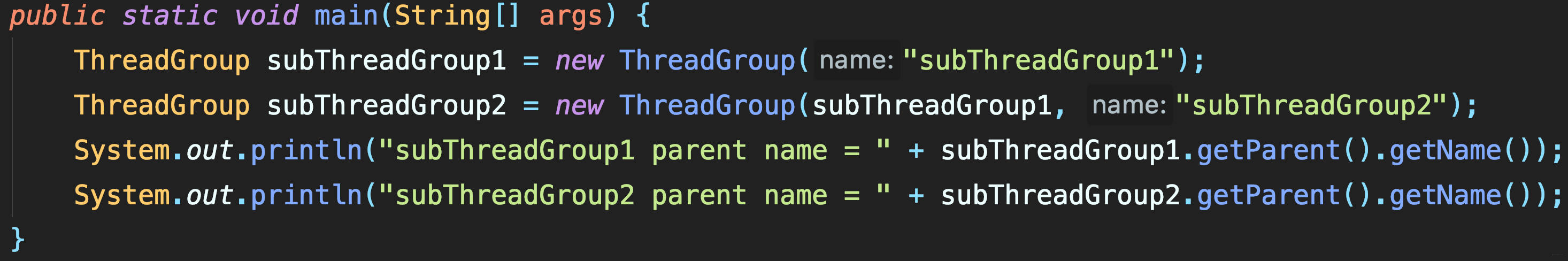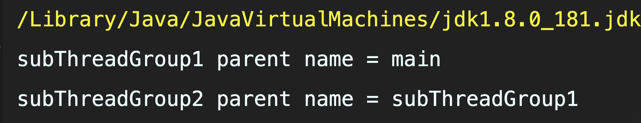 java.lang.ThreadGroup[name=main,maxpri=10] Thread[main,5,main] java.lang.ThreadGroup[name=subgroup 1,maxpri=10] java.lang.ThreadGroup[name=subgroup 2,maxpri=10]
