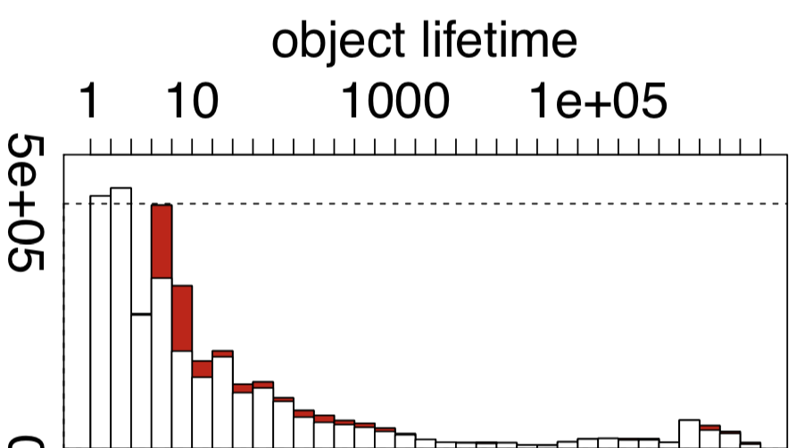 - pmd中Java对象生命周期的直方图,红色的表示被逃逸分析优化掉的对象