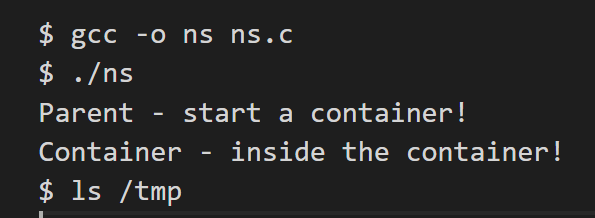 int container_pid = clone(container_main, container_stack+STACK_SIZE, CLONE_NEWNS | SIGCHLD , NULL);