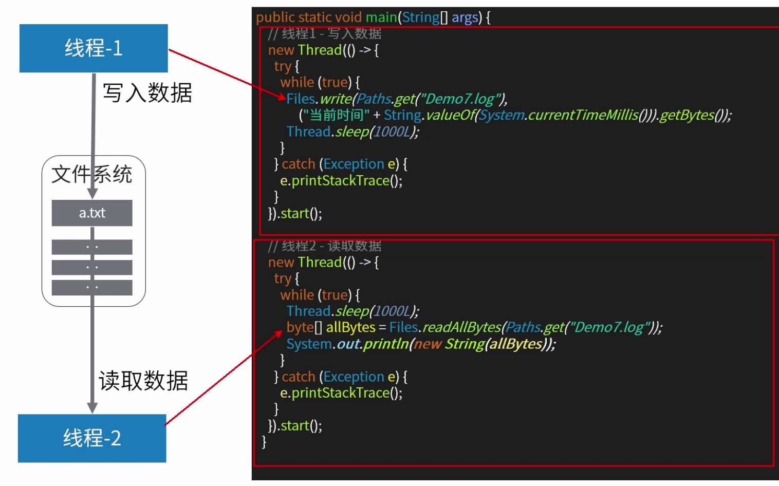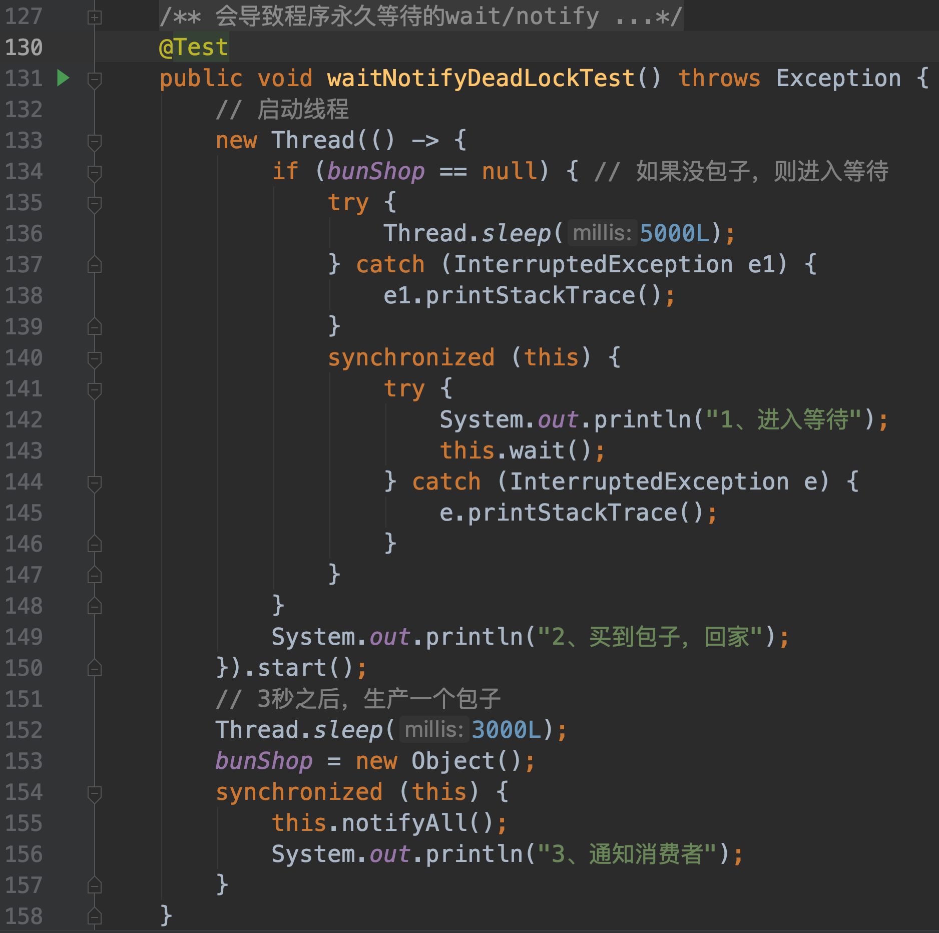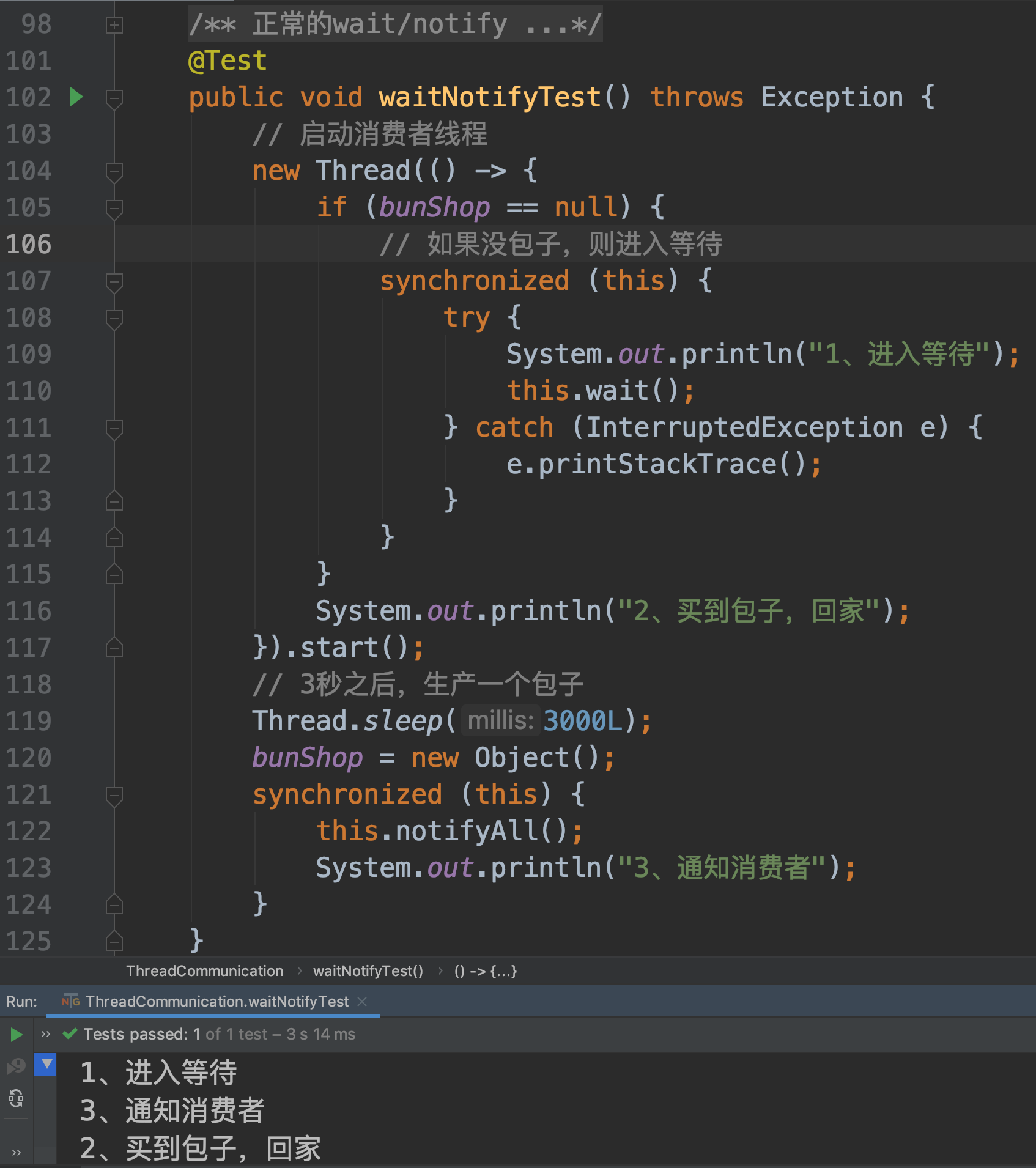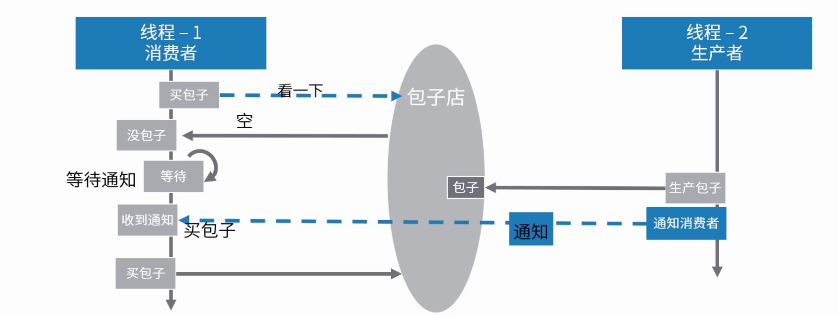 示例:线程1去买包子,没有包子,则不再执行。线程-2生产出包子,通知线程-1继续执行。