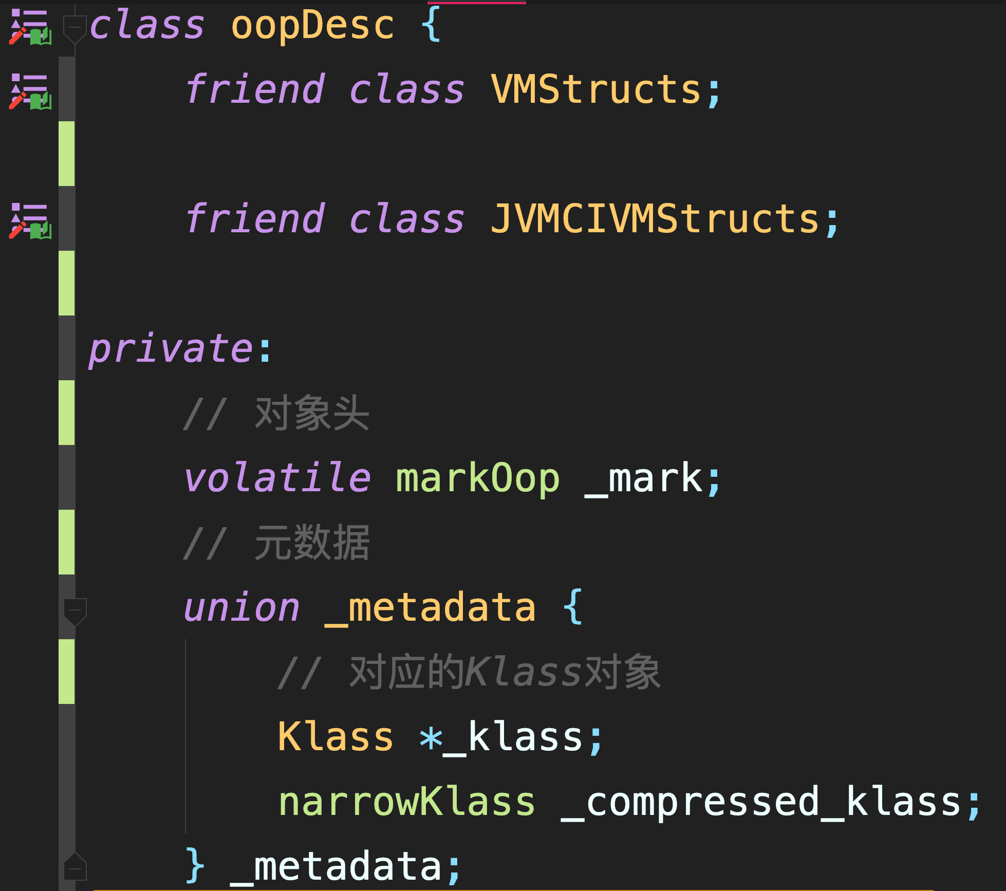 _mark _mark是一个markOop实例,它描述了一个对象的头信息,用于存储对象的运行时记录信息,如哈希值、GC分代年龄、锁状态标志、线程持...
