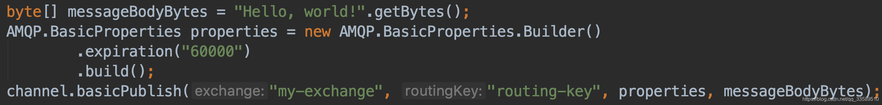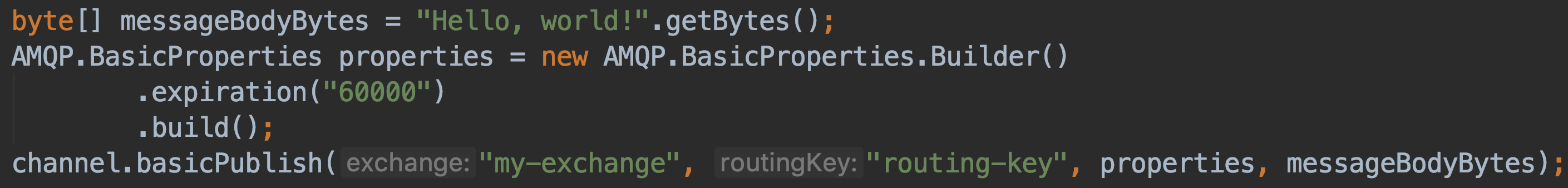 以下示例使用RabbitMQ Java客户端发布一条消息,该消息可以驻留在队列中最多60秒: