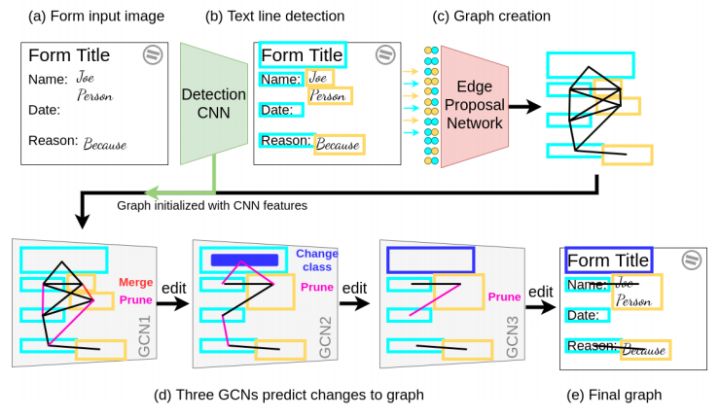 FUDGE,是一种可视化的表单理解方法,通过结合文本片段(图形顶点)和以迭代的方式修剪边缘来编辑图形结构,以获得最终的文本实体和关系。可以应用于文本识别困难的表单(如降质的或历史表单),以及因为预训练一些语言模型是具有挑战性的资源匮乏的语言表单。FUDGE 在历史题材 NAF 数据集上是最先进的。