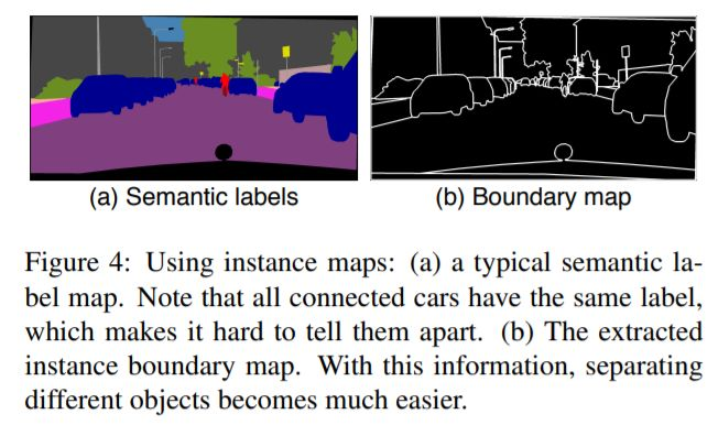 pix2pix使用语义分割图进行训练,但是对于同一类的相邻物体,如上图(a)中的相连的汽车,它们之间是没有边界的,这样生成的时候会导致模糊。因此使用实例分割的图进行训练,因为它包含了相邻同一类别的不同物体之间的边界,也可以说instance-level semantic label map包含了每一个物体的单独的ID。