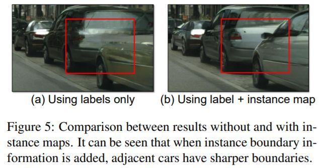 从下图中可以看到添加了instance map的网络对紧挨着的相同类物体的生成更加真实。