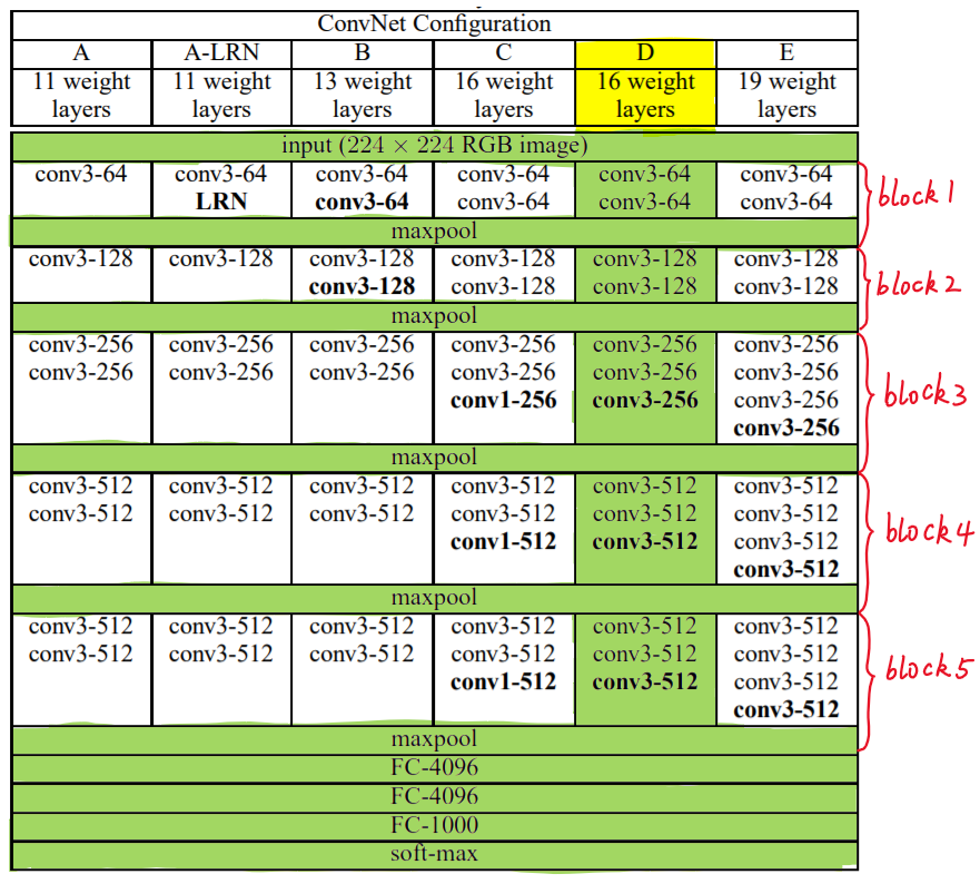 上图中,每一列对应一种结构配置。例如,图中绿色部分即指明了VGG16所采用的结构。