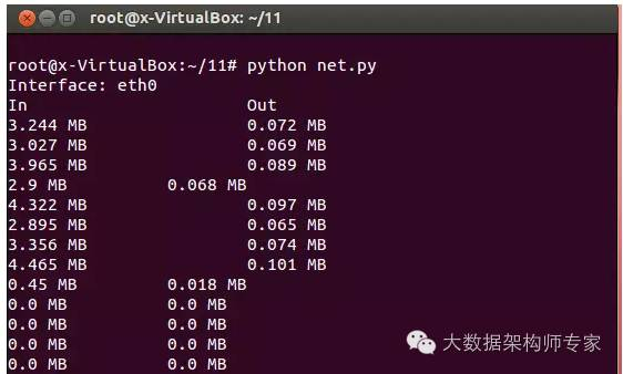 简单说明一下清单 4:清单 4 读取/proc/net/dev 中的信息,Python 中文件操作可以通过 open 函数,这的确很像 C 语言中的 fopen。通过 open 函数获取一个 file object,然后调用 read(),write()等方法对文件进行读写操作。另外 Python 将文本文件的内容读入可以操作的字符串变量非常容易。文件对象提供了三个“读”方法: read()、readline() 和 readlines()。每种方法可以接受一个变量以限制每次读取的数据量,但它们通常不使用变量。 .read() 每次读取整个文件,它通常用于将文件内容放到一个字符串变量中。然而 .read() 生成文件内容最直接的字符串表示,但对于连续的面向行的处理,它却是不必要的,并且如果文件大于可用内存,则不可能实现这种处理。.readline() 和 .readlines() 之间的差异是后者一次读取整个文件,象 .read() 一样。.readlines() 自动将文件内容分析成一个行的列表,该列表可以由 Python 的 for … in … 结构进行处理。另一方面,.readline() 每次只读取一行,通常比 .readlines() 慢得多。仅当没有足够内存可以一次读取整个文件时,才应该使用 .readline()。最后清单 4 打印出网络接口的输入和输出情况。