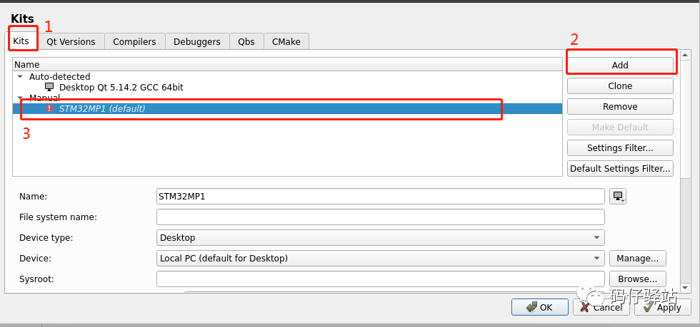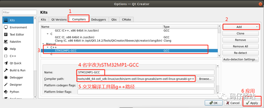 2、首先添加交叉编译工具链的qmake路径。注:不同平台的交叉编译工具链不一样,以官方或开发商提供为准,此处使用的stm32mp1交叉编译工具链。