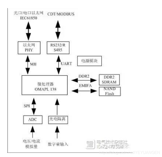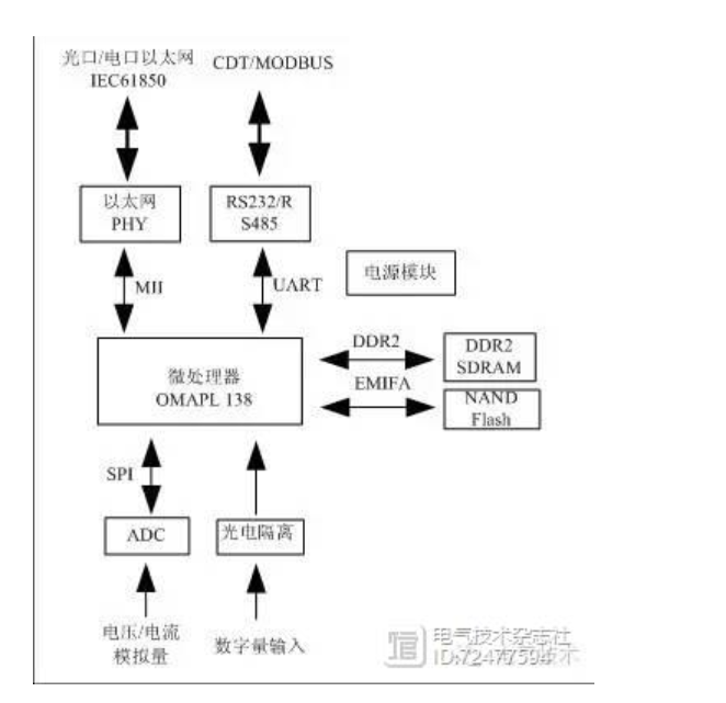 OMAPL138通过MII接口将自身的以太网控制器与外部的以太网的物理层芯片相连,实现以太网通信,通过以太网接口以IEC61850规约向后台发送采集数据。