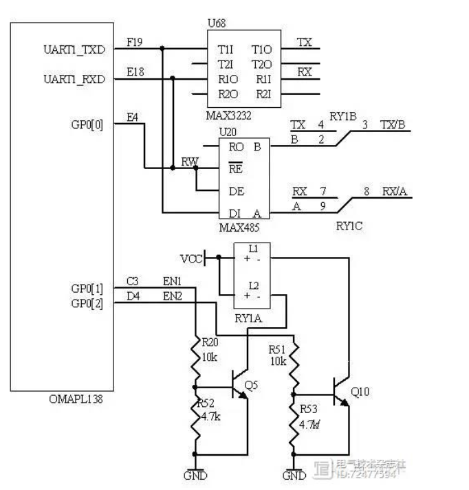 RS232/RS485复用方案电路图如图2所示,OMAPL138的UART口的发送引脚接RS232模块MAX3232的发送输入引脚和RS485模块MAX485的发送输入引脚,UART口的接收引脚接RS232模块MAX3232的接收输出引脚和RS485模块MAX485的接收输出引脚。
