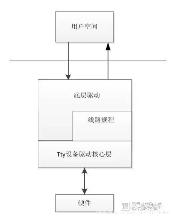 从图4中可以看出,用户空间的指令传递数据至底层驱动层,经线路规程处理调度后传递到tty设备驱动核心层,从而按照指令对应的功能操作硬件。某些情况下也可不经过线路规程,直接经底层驱动传递到驱动核心层进行处理。