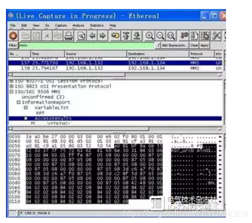 IEC61850通信的验证可通过以太网抓包工具MMS Ethereal抓取MMS报文查看数据上送情况。两种规约的上送报文的截屏分别如图6和图7所示,通过两种规约报文和继电保护测试仪输出的数据进行对比可以得知本设计能够满足最初的设计要求。
