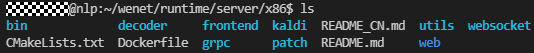 - 在服务化方面,WeNet分别实现了基于WebSocket和基于gRPC的两套服务端与客户端,基于WebSocket的实现位于websocket文件夹下,基于gRPC的实现位于grpc文件夹下,两种实现的入口main函数代码都位于bin文件夹下。
