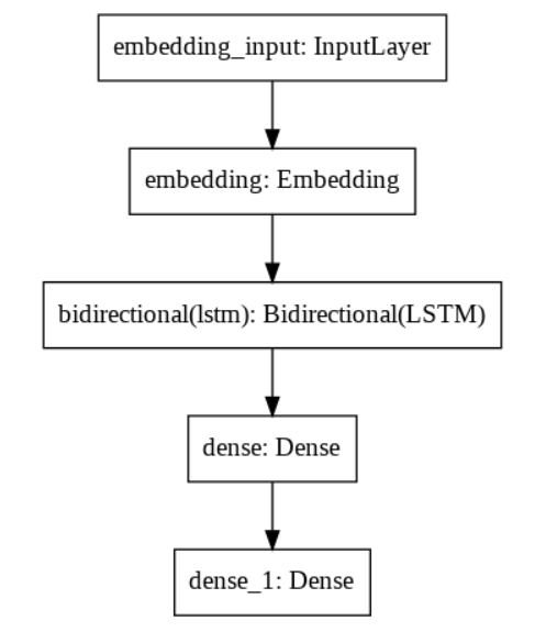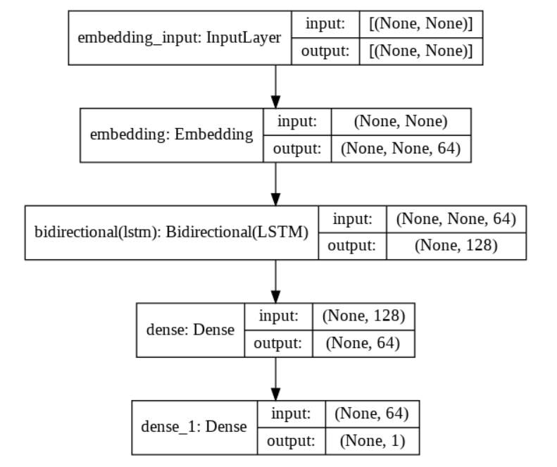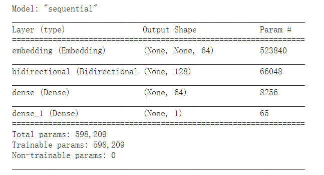 包装器也可以与 RNN 层(64个结点的LSTM网络)一起使用;这将通过 RNN 层向前和向后传播输入,然后连接输出。这有助于 RNN 学习长程依赖关系。