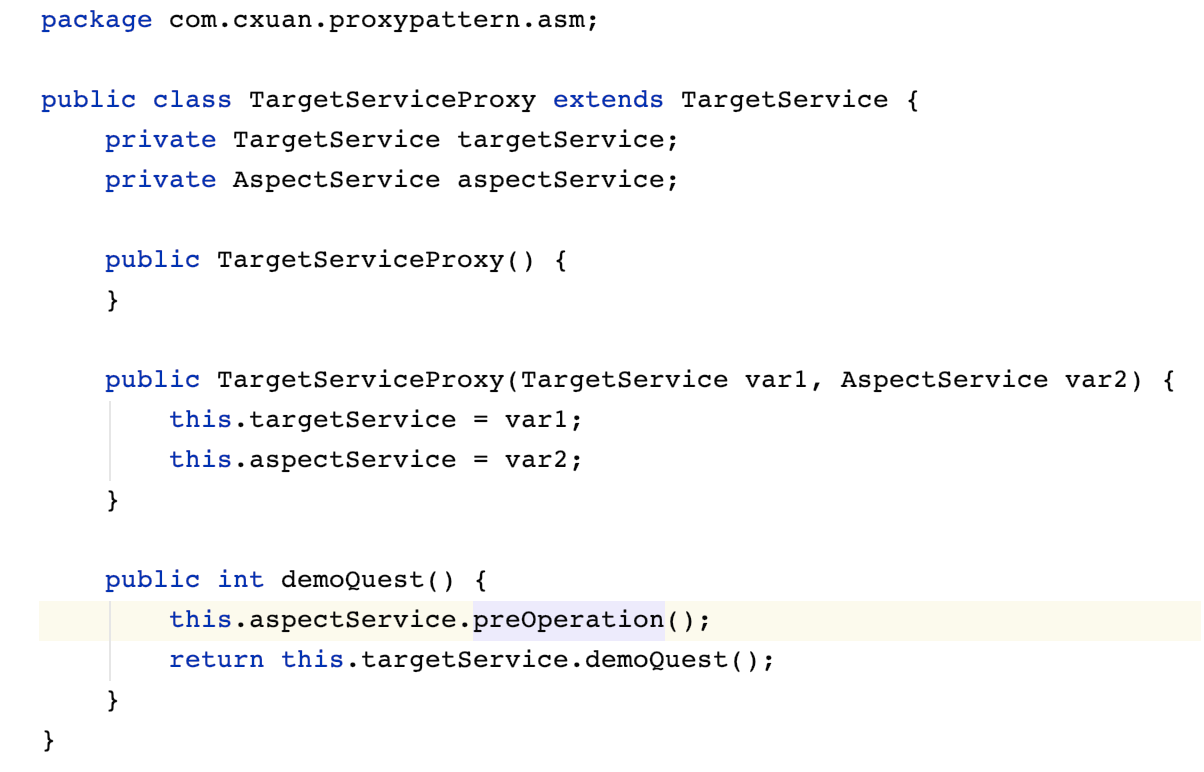 使用 ASM 生成动态代理的代码比较长,上面这段代码的含义就是生成类 TargetServiceProxy,用于代理TargetService ,在调用 targetService.demoQuest() 方法之前调用切面的方法 aspectService.preOperation();