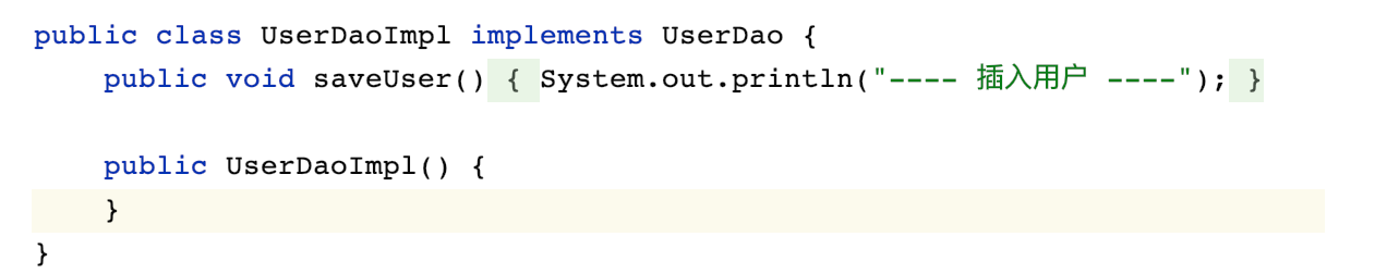 public class UserDaoImpl implements UserDao{ @Override public void saveUser() { System.out.println(" ---- 保存用户 ---- "); }