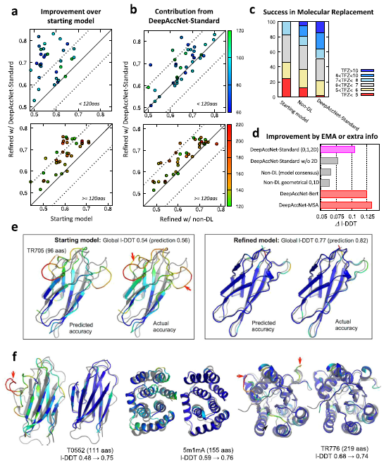 作者发现,基于网络的准确性预测会不断提高基准示例的准确性。通过更新的方案,无论蛋白质大小如何,在起始模型上均观察到一致的改善(图4a), 对每个残基模型质量的更详细预测也与实际值非常吻合(图4e)。作者还评估了准确度预测对改进模型质量的实际影响(图4c), 从DeepAccNet 柱状图预测得出的残基对约束对于成功提炼至关重要(图4d)。如图4f所示,改进包括在整体结构正确时识别和修改错误区域,精度预测网络通过两种方式促进了这一总体改进:它提供了对不可靠的距离对和区域的更准确的估计;其次,它提供了一种有效地估计距离的方法。