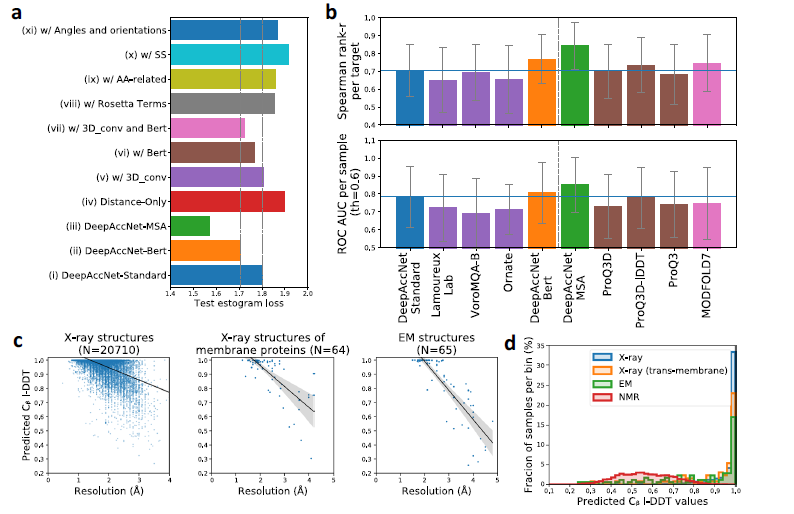 为了研究每种特征对网络性能的贡献,作者在训练过程中一次将每种功能与距离图结合在一起,并通过交叉熵损失和测试集上的Cβ1-DDT得分均方误差来评估性能(图3a)。除了MSA特征外,最大的贡献来自基于3D卷积特征和Bert嵌入。作者调查了网络在X射线晶体学,核磁共振波谱(NMR)和电子显微镜(EM)所确定的实验结构上的性能,对于高分辨率晶体结构,DeepAccNet变体的预测Cβl-DDT值接近1.0,而对于较低分辨率的结构,Cβ1-DDT值则有所降低(图3c), 核磁共振结构的预测准确度低于高分辨率晶体结构(图3d)。作者将DeepAccNet变体与其他精度估算器进行了比较(图3b),从最近的CASP实验中可以明显看出,从多个序列比对中得到的协同进化信息提供了详细的结构信息。DeepAccNet-Bert包含Bert嵌入,这些嵌入是由单个序列生成的,没有任何进化比对,在没有同源序列信息的蛋白质上,它在EMA任务上的表现优于DeepAccNet-MSA,当有多个序列比对信息时,DeepAccNet-MSA将是一个更可靠的选择,显示了最先进的性能。