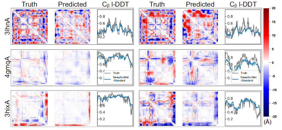 图2显示了对于三个靶蛋白(3lhnA,4gmqA和3hixA),在两个随机选择的诱饵结构上没有MSA或Bert嵌入的DeepAccNet预测。在每种情况下,网络都会为两个诱饵生成不同的有符号残基-残基距离误差图,这些图在质量上类似于结构误差的实际模式。网络还可以准确预测不同诱饵的每个残基模型准确性(Cβ1-DDT分数)的变化, 总体而言,详细的预测提供了有关结构的哪些部分需要移动以及以何种方式指导优化的大量信息。