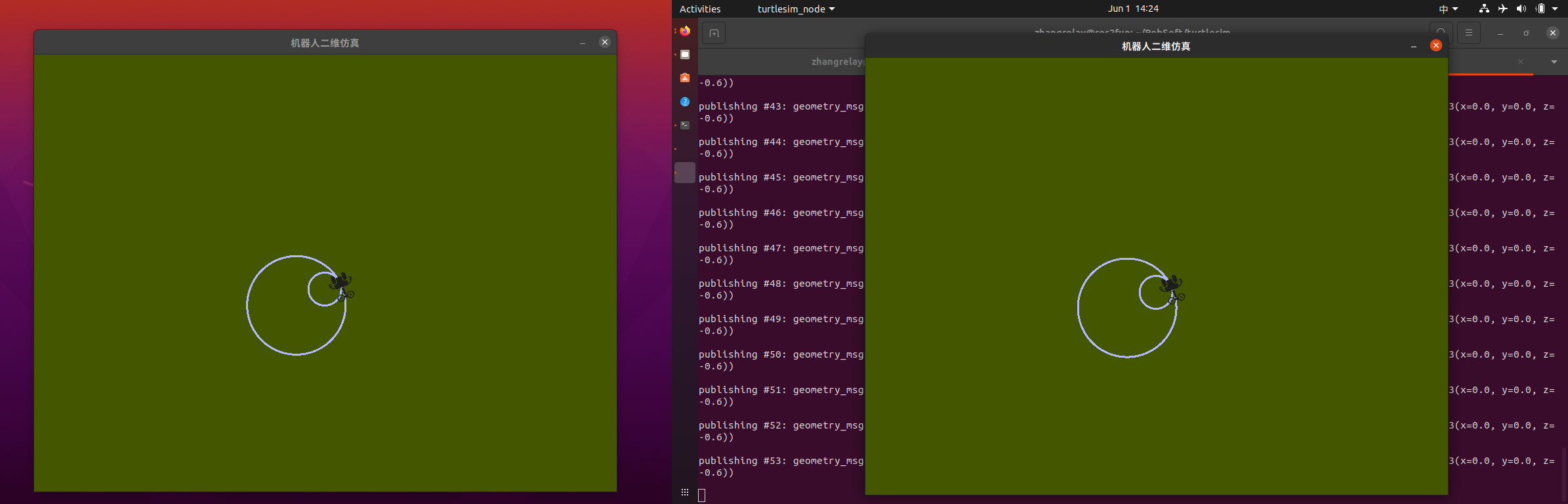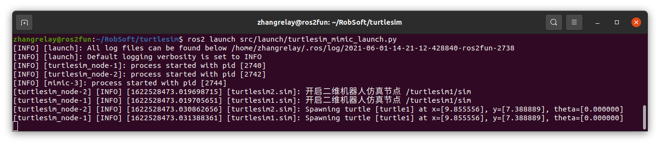 两个turtlesim窗口将打开,将看到以下[INFO]消息,告诉启动文件已启动的节点: