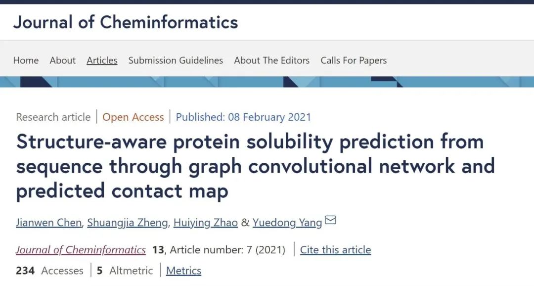 Chen, J., Zheng, S., Zhao, H. et al. Structure-aware protein solubility prediction from sequence through graph convolutional network and predicted contact map. J Cheminformatics 13, 7 (2021).