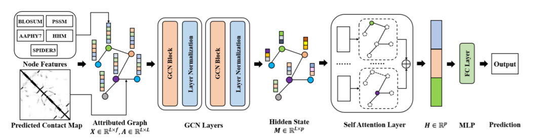 这项工作中,作者将蛋白质溶解度预测任务转换为基于图的回归问题。给定一个由????个氨基酸组成的蛋白质序列,整个蛋白质因此可以表示为拓扑属性图????(????,????),其中F代表所有残基(节点)的特征集,????代表残基接触(边缘)。根据预测的蛋白质接触图,通过图卷积神经网络模型输出预测的溶解度。