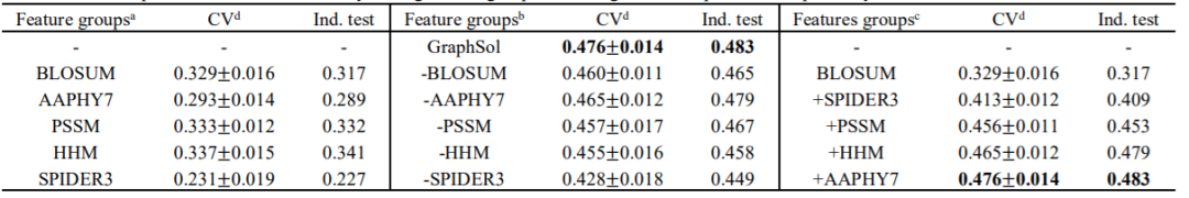作者测试了eSOL数据集上GraphSol模型的性能。如表2所示,对于5折CV和独立测试,获得的R2值分别为0.476±0.014和0.483。当通过0.5的临界值将数据集分为两个离散状态(可溶或不可溶)时,对于5折CV和独立测试,AUC值分别为0.855和0.866, CV和独立测试的相似结果表明了GraphSol模型的鲁棒性。为了表明特征组的重要性,作者在消融研究中通过3种方式评估了性能。如表2所示,当将单个要素组用作节点要素时,在独立测试中,HHM产生的R2最高。预测的结构特征组(SPIDER3)的性能最差。相反,当去除单个基团时,去除SPIDER3导致最大的下降,这可能是因为SPIDER3提供了唯一的结构信息,而其他功能则具有补充功能。当通过递归添加特征组来评估模型时,模型会随着每个特征组的添加而显示出递增的性能。添加SPIDER3特征后,性能迅速提高,这反映了溶解度和结构特征之间的关系。