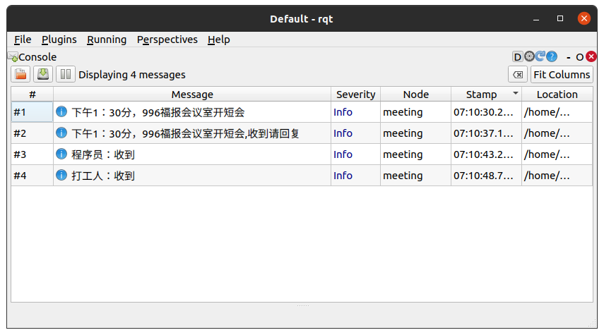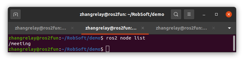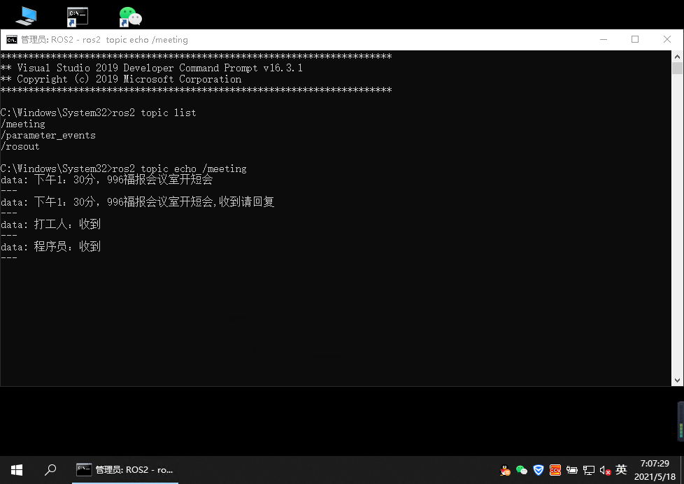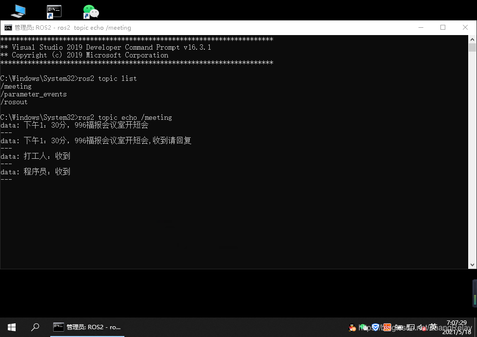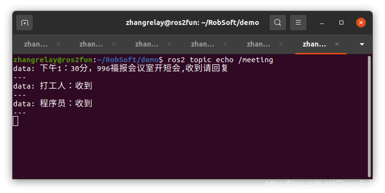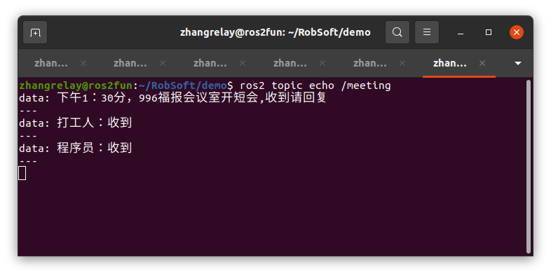 - ros2 topic pub /meeting -1 std_msgs/msg/String data:\ "下午1:30分,996福报会议室开短会"