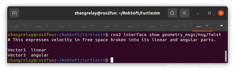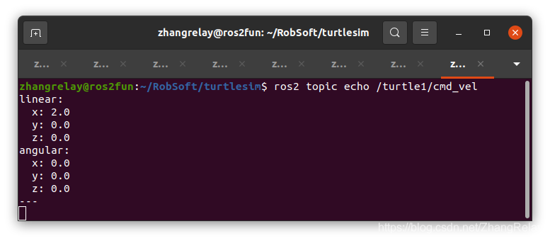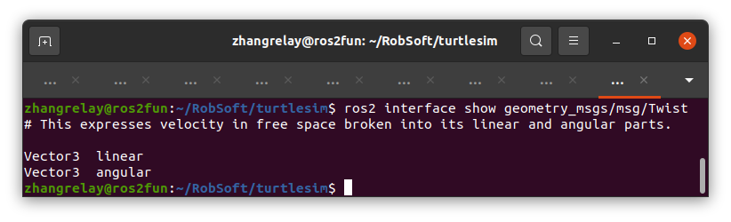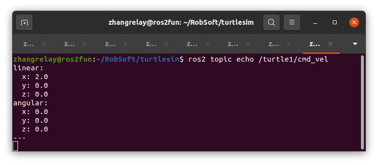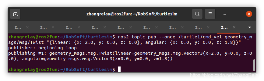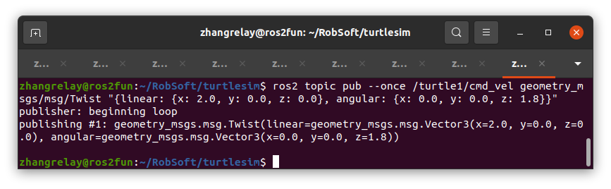 ros2 topic pub --once /turtle1/cmd_vel geometry_msgs/msg/Twist "{linear: {x: 2.0, y: 0.0, z: 0.0}, angular: {x: 0.0, y: 0.0, z: 1.8}}"