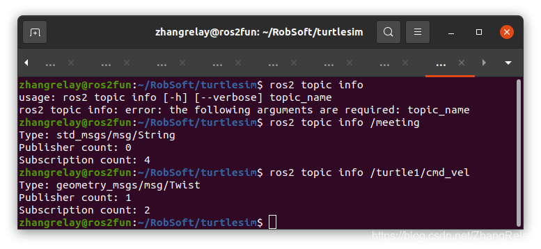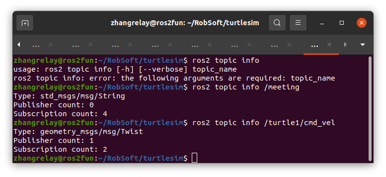 usage: ros2 topic [-h] [--include-hidden-topics] Call `ros2 topic <command> -h` for more detailed usage. ...