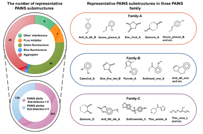 高通量筛选是药物研发的一个重要手段,然而研究中发现一些化合物在不同类型靶点筛选中均表现出阳性结果,这类化合物称为“频繁命中化合物”。其中,通过干扰实验条件而在多个实验中呈现出阳性结果的假阳性化合物是应该在药物研发前期尽量避免的无效投入。2010年,Baell等人在基于六个不同靶点AlphaScreen高通量筛选实验结果,并将其中频繁出现(≥4次)的化合物和相关结构总结为包含480个子结构的筛选规则PAINS(Pan-assay interference compounds)用于假阳性化合物筛选。这篇文章在Google Scholarship的引用次数已经超过2090次,药学领域权威杂志《Journal of Medicinal Chemistry》要求作者在提交论文时必须附带研究分子通过PAINS筛选规则的结果,对于含有PAINS子结构的化合物需要提供实验数据证明该化合物不是频繁命中化合物。然而,在实际应用中,PAINS规则筛选的化合物类型实际多种多样且甚至相互矛盾的,包括无活性化合物、已上市药物及候选化合物等。由于机制的不明确,使得后续PAINS规则筛选化合物的处理复杂且不明朗。