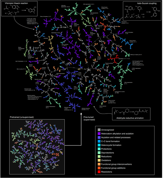 基于BERT模型,化学反应可以表示成一个固定维度的向量,研究者将不同化学反应描绘在一张图上,如图4,从图中可以观察到不同化学反应之间的关系。