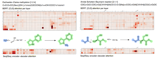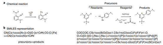 BERT模型基于“自注意力”机制,可以利用大规模的文本数据学习语言特征,研究者们首先将化学反应式转换为SMILES格式,相当于对化学反应式进行了语言描述,图1为两个化学反应式及其对应的SMILES 表示: