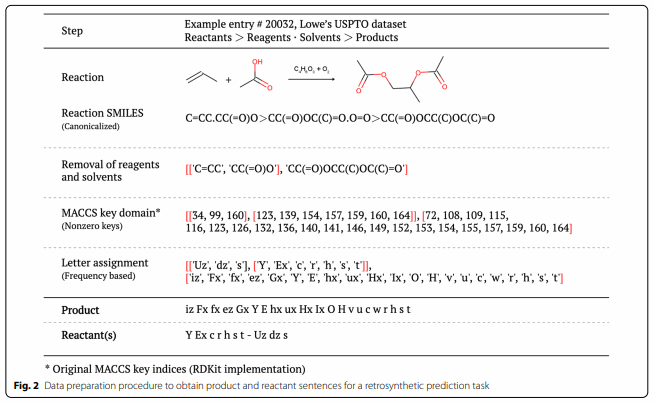 研究人员的模型只考虑策划MACCS键的非零指数。英语字母根据其频率的排序被分配到非零MACCS键上,形成独特的人工 "单词"。这种进一步的编码将产物和反应句转化为基于频率排序的字母键版本,意味着单词的位置信息,并使研究人员的方案适合使用序列到序列架构。单字母单词使用英语中最常见的21个字母的大写和小写生成。双字母词是通过为每42个单字母添加 "x "和 "z "来构建的,这使得可以覆盖所有126个MACCS键。因此,研究人员的字母片段词汇的长度固定为126个。