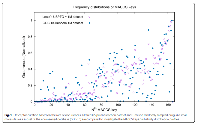 研究人员的方法中,一个分子被表示为一组使用MACCS键的片段。研究了数据集中每个MACCS键的出现次数。此外,研究人员还比较了100万个随机抽样的类药小分子的结果,是由9.75亿个分子组成的GDB-13的子集。本研究中,省略了5个从未出现过的键和9个在USPTO数据库中不常出现的键。根据比较,还排除了GDB-13数据库中从未或几乎没有观察到的另外26个密钥。