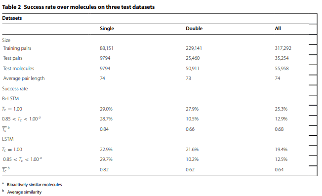 基于双向LSTM的模型优于基于单向LSTM的模型。对于所有数据集,精确匹配的成功率始终降低约6%。这可能是由于基于分子的MACCS密钥表示不依赖于密钥的顺序。换句话说,有关分子和化学反应的大多数信息都嵌入到键的共现中。