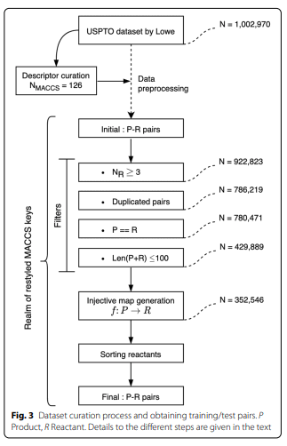 产物-反应物对数据集在经过研究人员的翻译机处理之前被进一步整理。用126个截短的MACCS键代表每个分子后,应用了一系列过滤器以去除相同的产物-反应物对和内部孪生分子。只要化学变化超出了基于MACCS键的表示的敏感性,它们就会出现。由于将分子与MACCS键关联以在子结构子空间上进行操作,因此会丢失一定数量的信息。