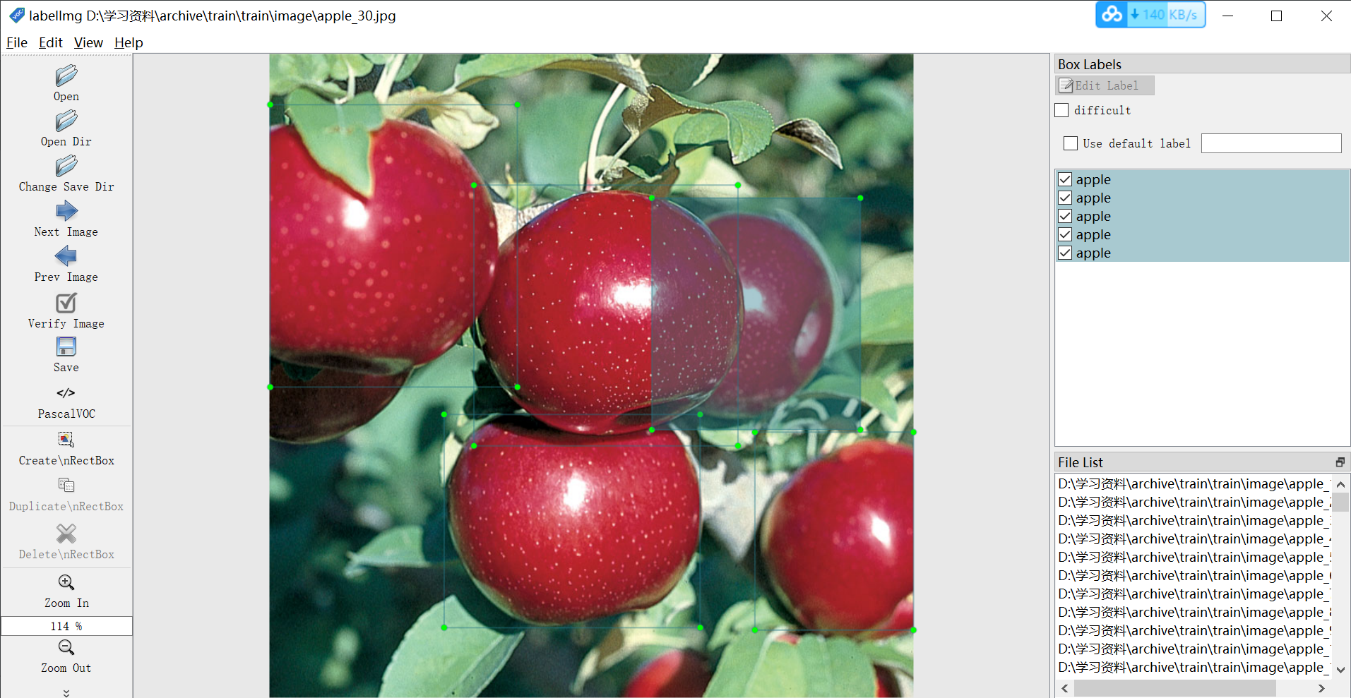 “打开目录”打开图片文件夹,选择第一张图片开始标注,用“创建矩形框”或“Ctrl+N”启动框,点击结束框,双击选择类别。完成一张图片点击“保存”保存后,XML文件已经保存到本地了。单击“下一张图片”转到下一张图片。