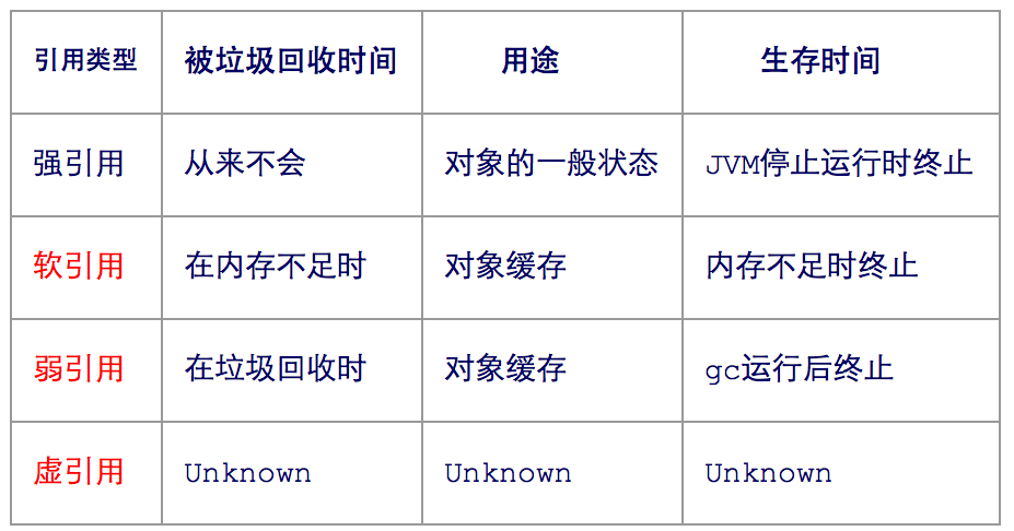 | 软引用 | Soft Reference | 描述一些还有用但并非必须的对象 | 在系统将要发生内存溢出的异常之前,将会把这些对象列进回收范围之中进行第二次回收。如果这次回收还没有足够的内存,才会抛出内存溢出异常 |
