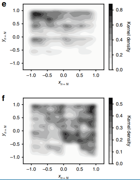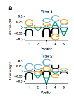 如图1.b所示,作者构建了一个以RNA序列作为输入的CNN,采用两个卷积层来识别输入序列中的合理基序和部分基序. 为了查看“黑匣子”内部,作者选择直接可视化训练后模型的权重和激活函数,将第一个卷积层“拆箱”,可视化模型认为重要的特征,方法是将从输入序列中学到的滤波器权重解释为序列标志(图2a)。为了了解卷积滤波器的趋势,作者对CNN进行了20次训练,并探索了滤波器组合中三聚体的频率(图2b)。当与均匀分布下的预期值进行比较时,“ CCC”三聚体的出现频率比预期高出近2.5倍,这表明该模型可以学习该基序以改善预测。此外,训练好模型将学会忽略实验节点中过度表现的序列(例如,AGA和GAG)。